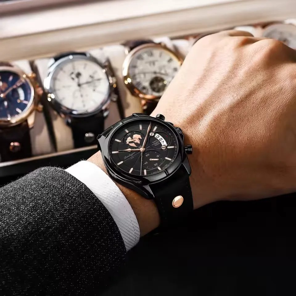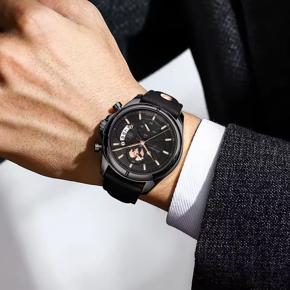 Montre homme POEDAGAR haut de gamme, chronographe, date, étanche, bracelet en cuir, montre à quartz pour homme, montre-bracelet homme tendance. (noir)